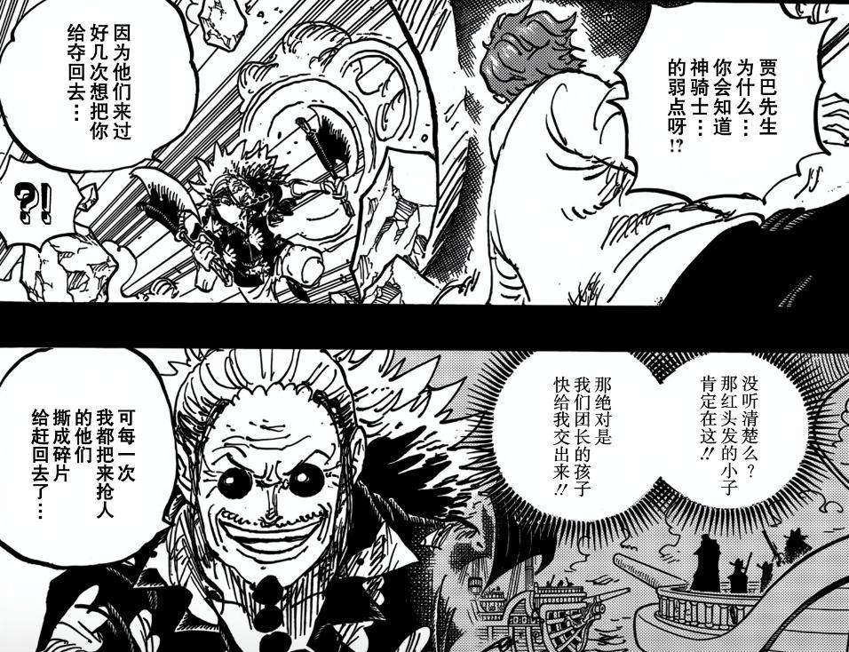 還有賈巴提到一個非常關鍵的信息點!很多年前神之騎士團多次來找羅傑海賊團搶奪香克斯,因爲他們發現香克斯就是他們團長加林的兒子。