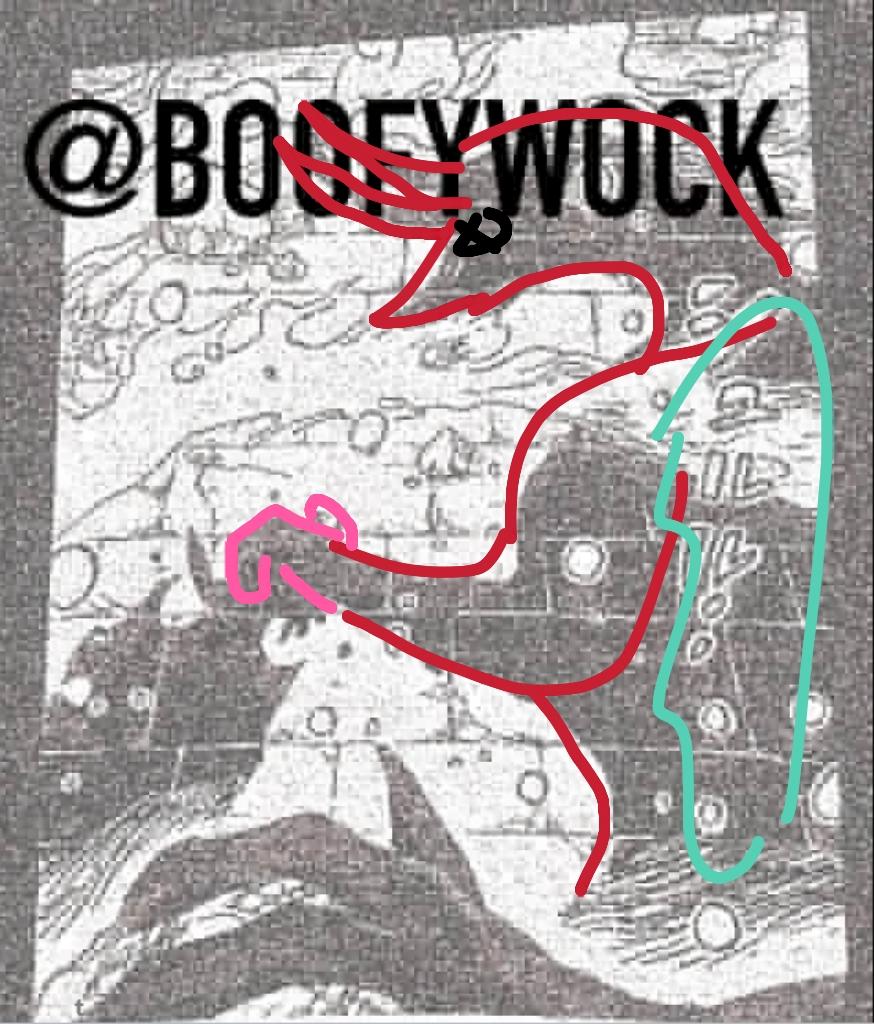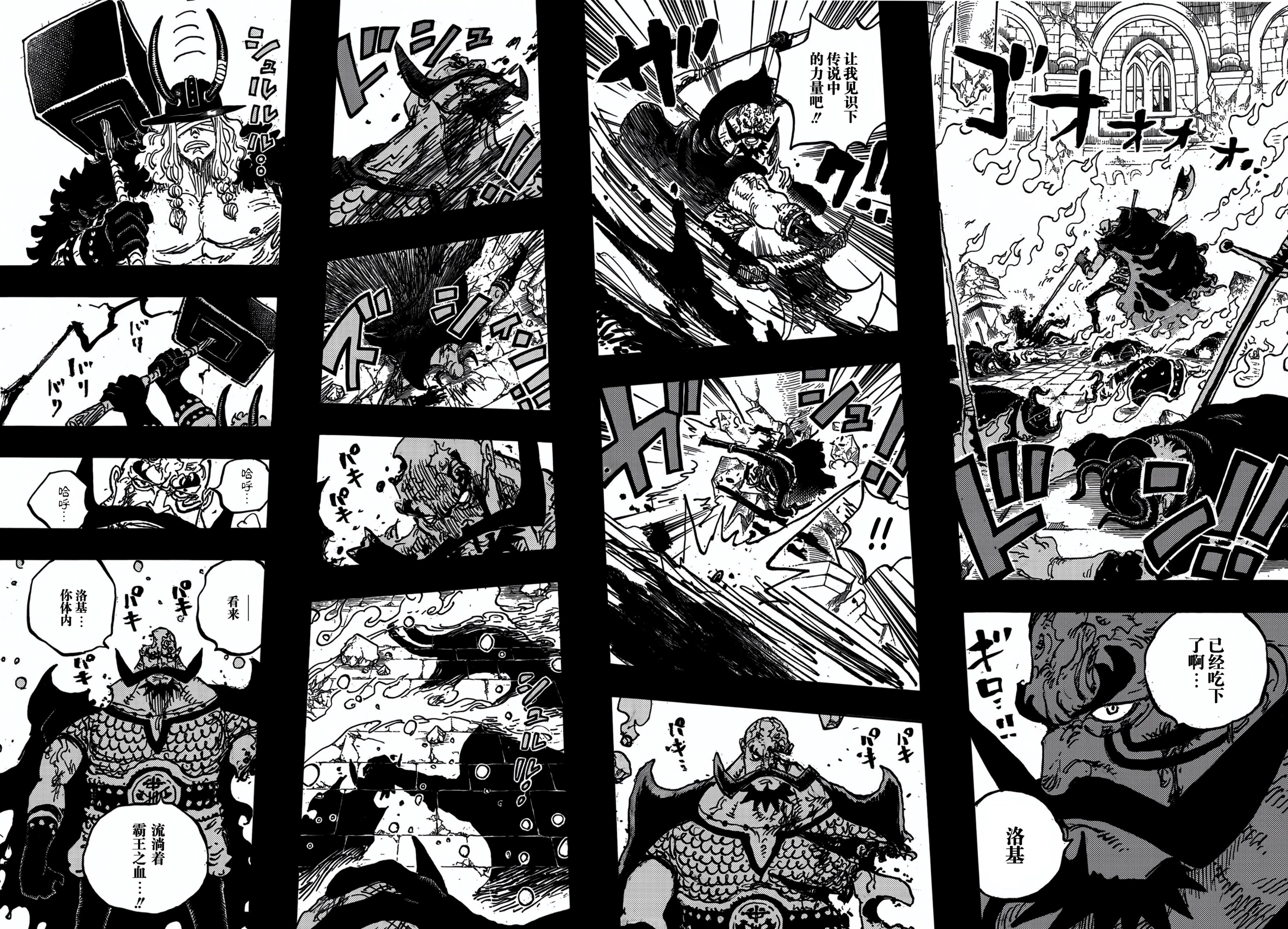 漫畫裏呈現出來洛基喫下惡魔果實後的變身細節,利爪,背後的尖刺,巨大的身軀,行走的部分姿態。
