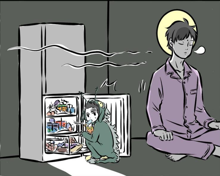 很快大士就飄過廚房,我們可以發現此時的哪吒正打開冰箱,正在翻找着好喫的,顯然是和白澤一樣