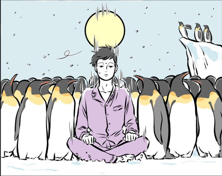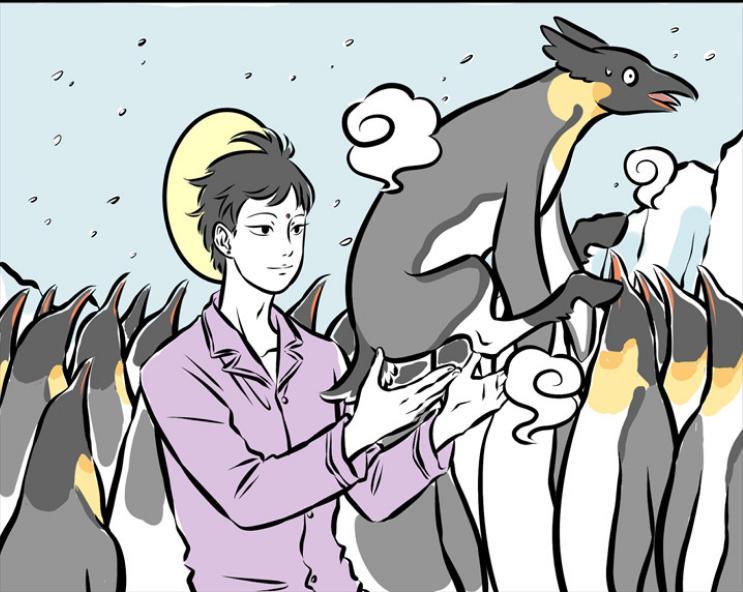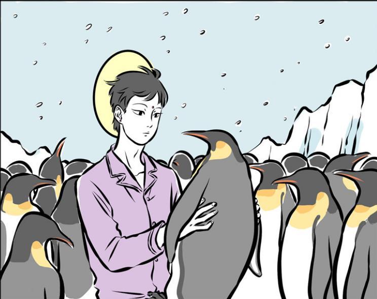 而不知道什麼時候,大士的身邊已經圍了好多企鵝,它們十分溫順地聚集在大士身邊