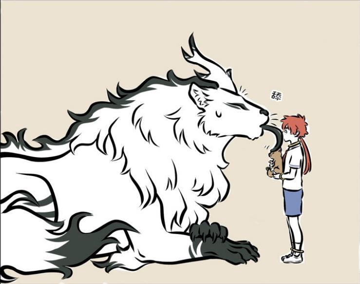 只見白澤伸出舌頭,輕輕舔舐小狗,當然因爲白澤的舌頭足夠長,所以連帶着紅孩兒也舔了一下。
