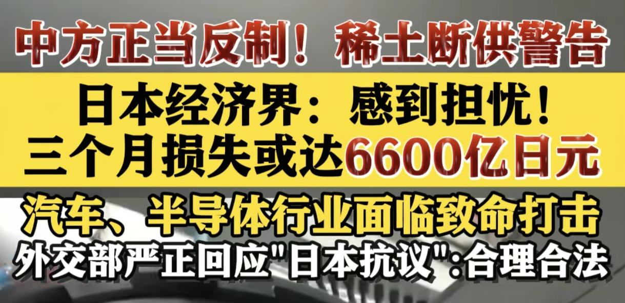在軍民兩用物品管控禁令後,日本經濟界人士預測,僅在稀土方面,預計三個月之內的經濟損失或高達6600億日元,摺合人民幣約300億。