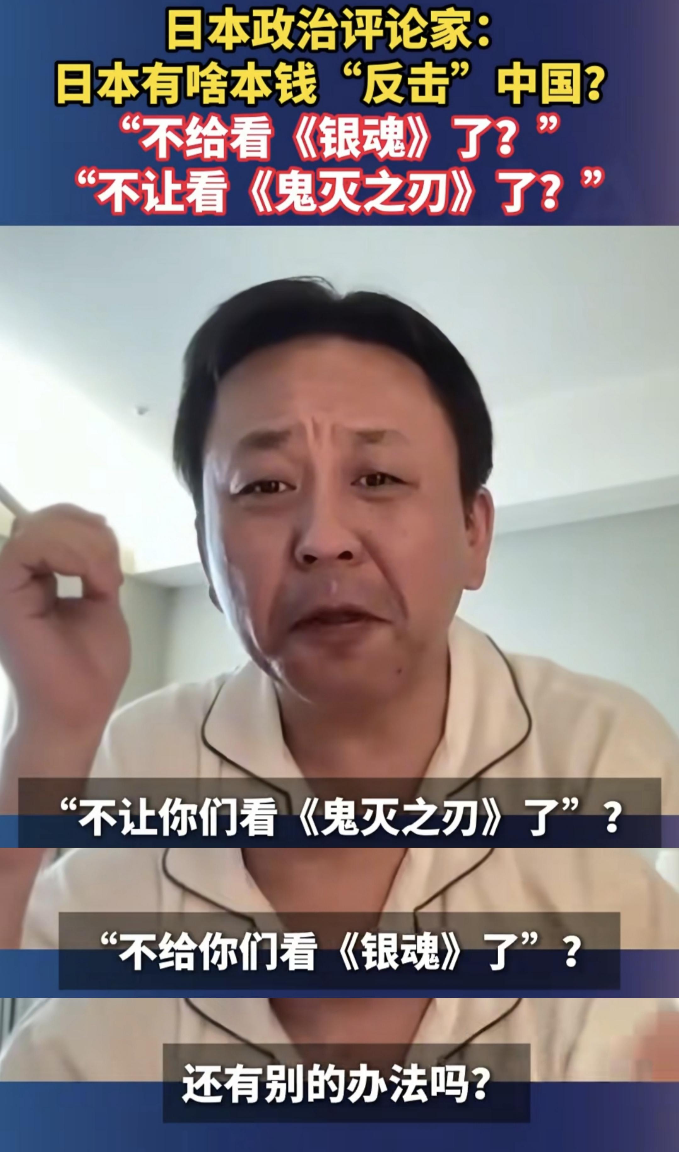 而近期,有日本政治評論家發言:日本是沒有任何本錢去反擊中國的,就連小學生都知道,中國的國力是遠超日本的,作爲弱勢的一方,日本真的有反擊的手段嗎?不會到時候,能做的就是不讓他們看《銀魂》,不讓他們看《鬼滅之刃》這種事吧?