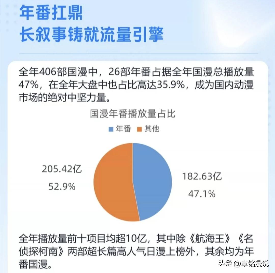 此外,燈塔數據還指出,2025年全年406部國漫裏,26部年番佔據了全國漫總播放量的47%,在大盤中佔比達35.9%,成爲市場中堅力量,且播放量前十的項目均超10億,除兩部日漫外均爲年番國漫。