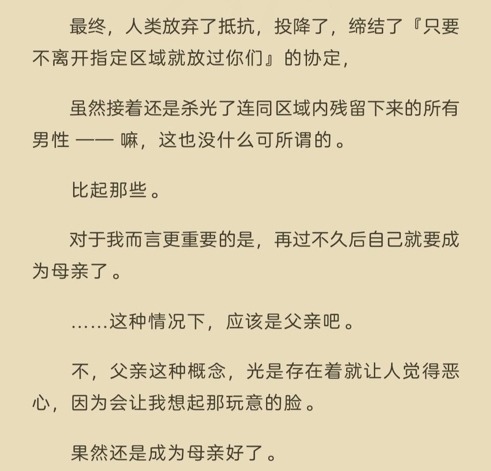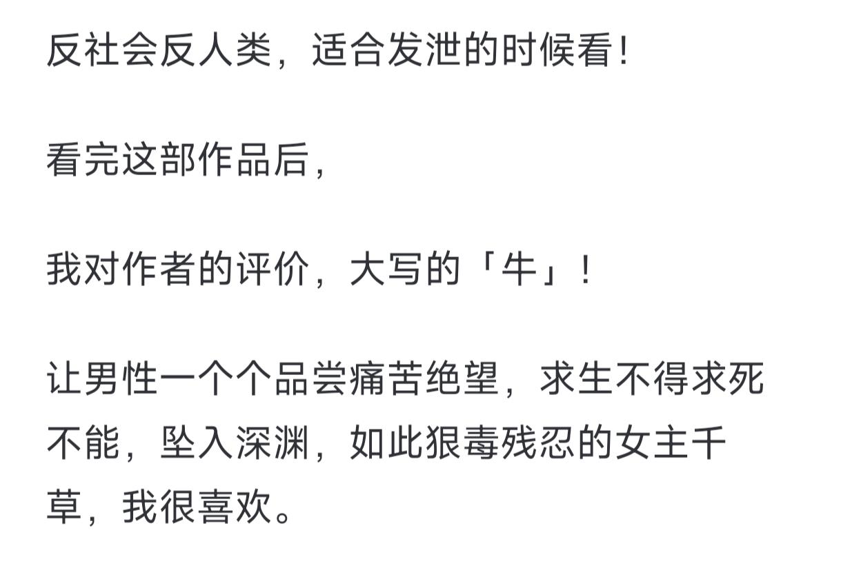 當然了,這部作品的女主本身就三觀不正,不排除原作者就是想塑造一個極端形象的女主,從而加入這些厭男設定。