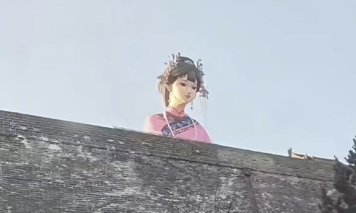 再聯想到,我們山西這邊前段時間,大同古城搞得主題燈,仕女雕塑,當時也不知道哪個網友拍攝的照片,從城牆的一邊看去,雕塑就是一個活脫脫的“巨人”。