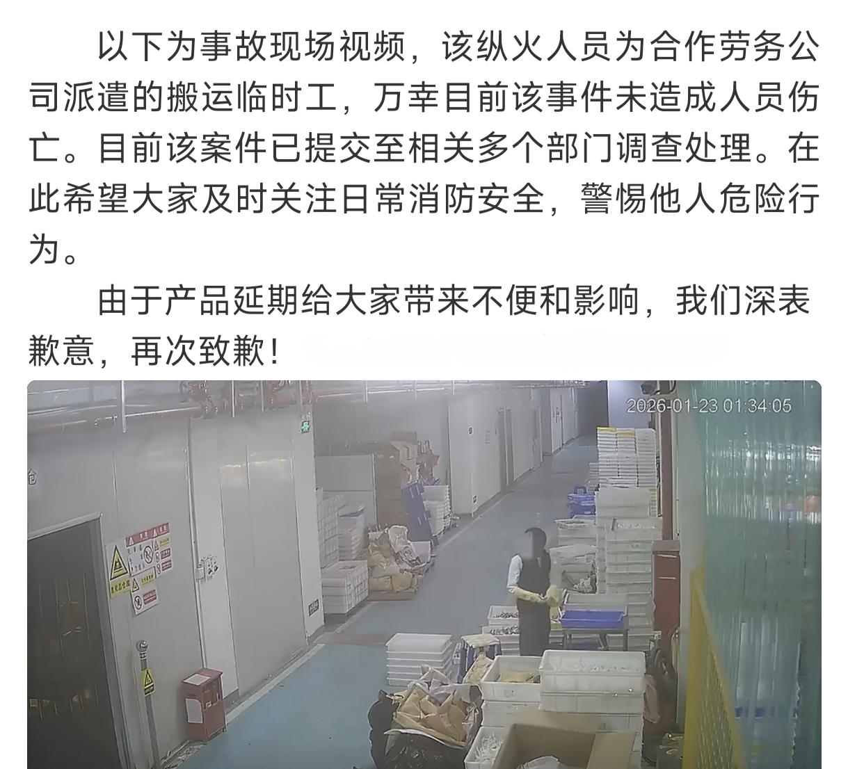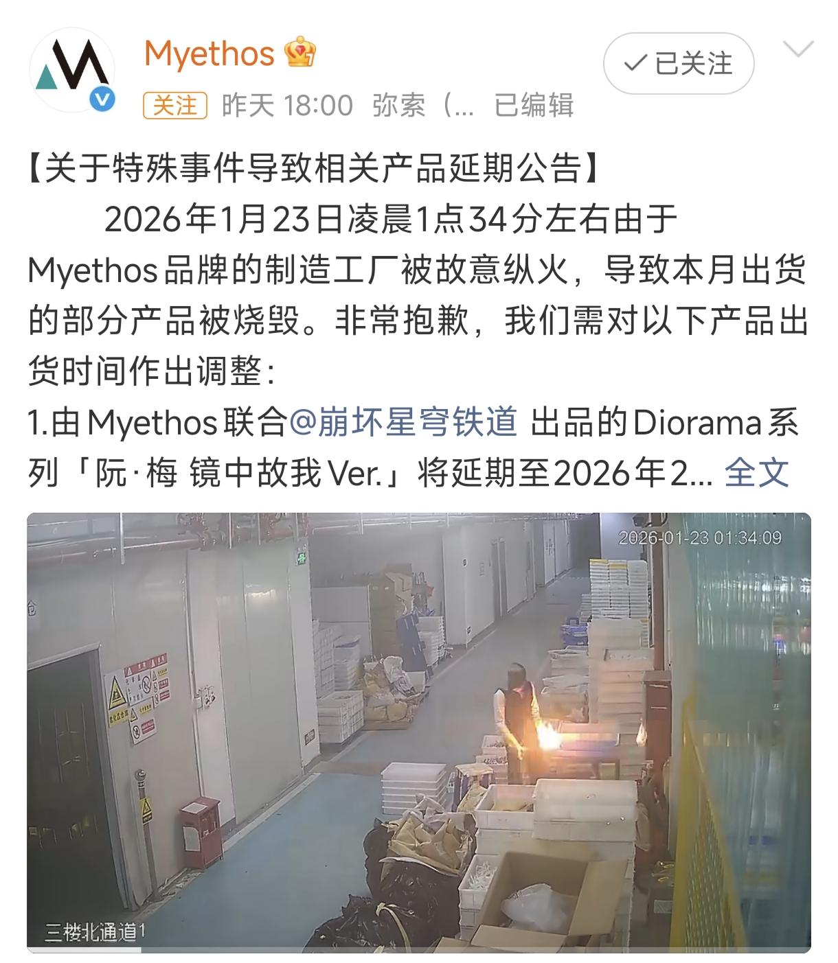 但就在2026年1月23日凌晨一點三十四分,MYETHOS廠家被人惡意縱火,導致了本將在本月出貨的一批手辦被燒燬。