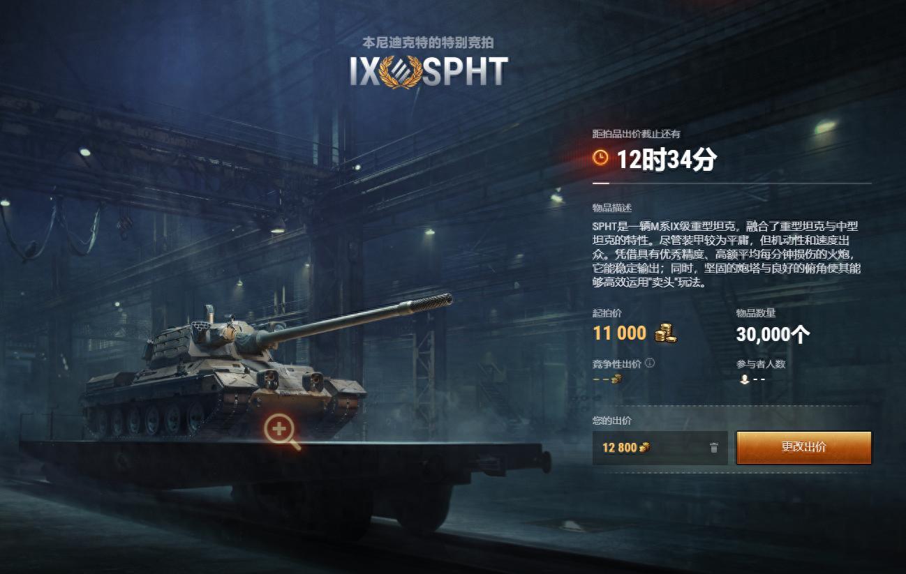 坦克世界冬季拍賣進入第2日,強勢九金SPHT登場,1.1萬金幣起售!