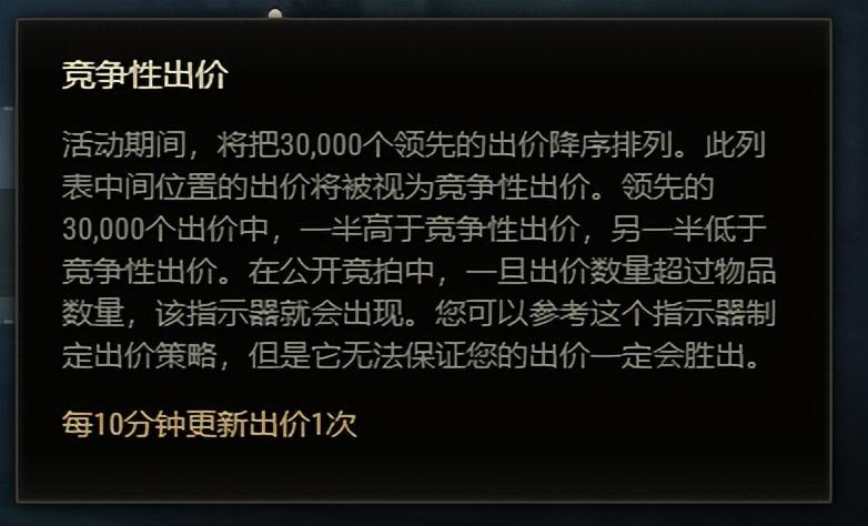 它的拍賣形式是英國式的,就是比各自的出價高低。出價時間是今天早上十點鐘開始,直到今晚十一點截止。因此車長們有幾乎一整天時間來競爭這臺首發總數3萬臺,起拍價1.1萬金幣的新車。而在競價期間,官方也會顯示出價中位數,給車長們提供參考。