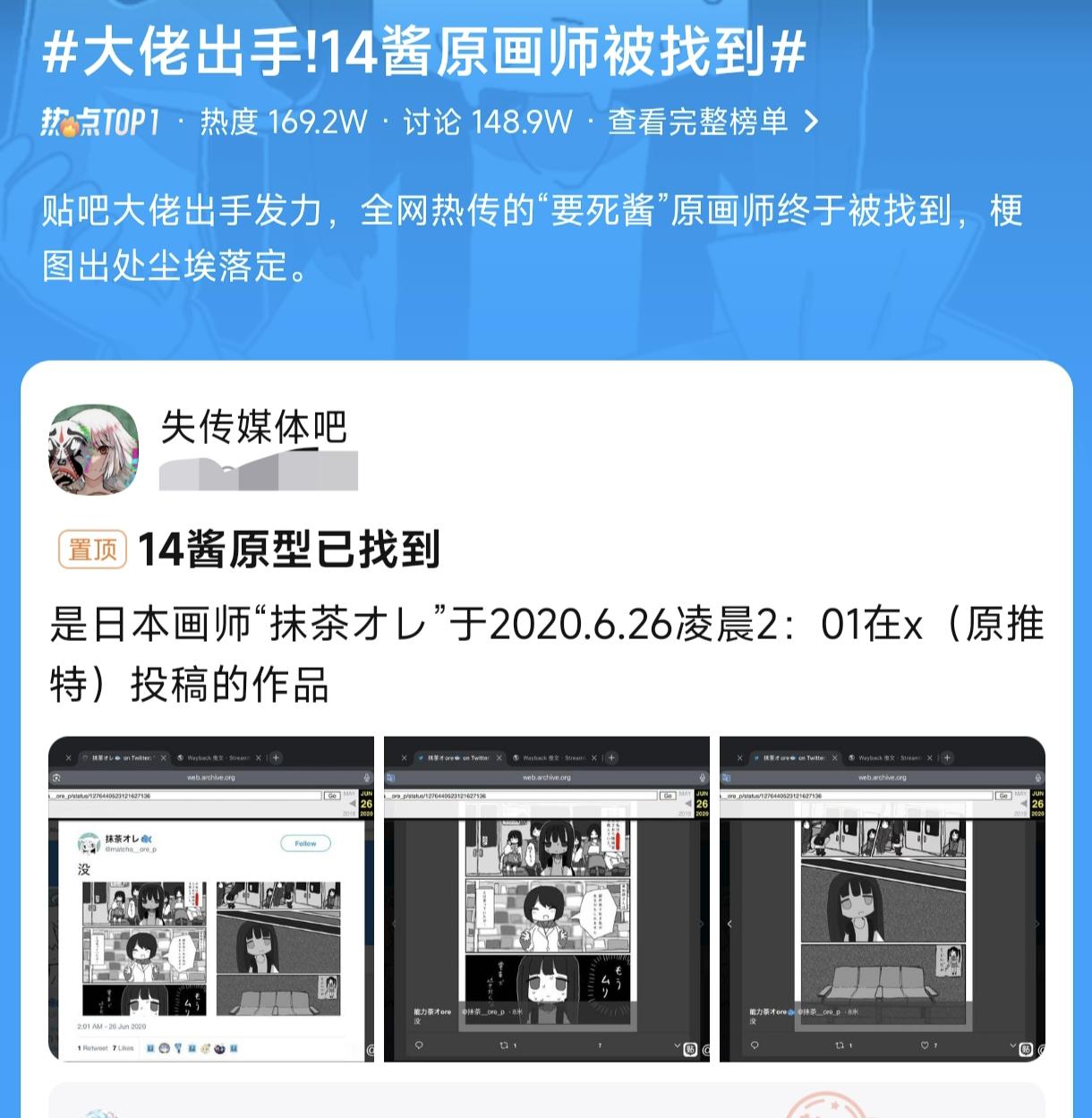 在假冒作者鬧劇收場後,真正的突破終於出現。失傳媒體吧終於找到“14醬”原作者,這位日本畫師“抹茶オレ”。