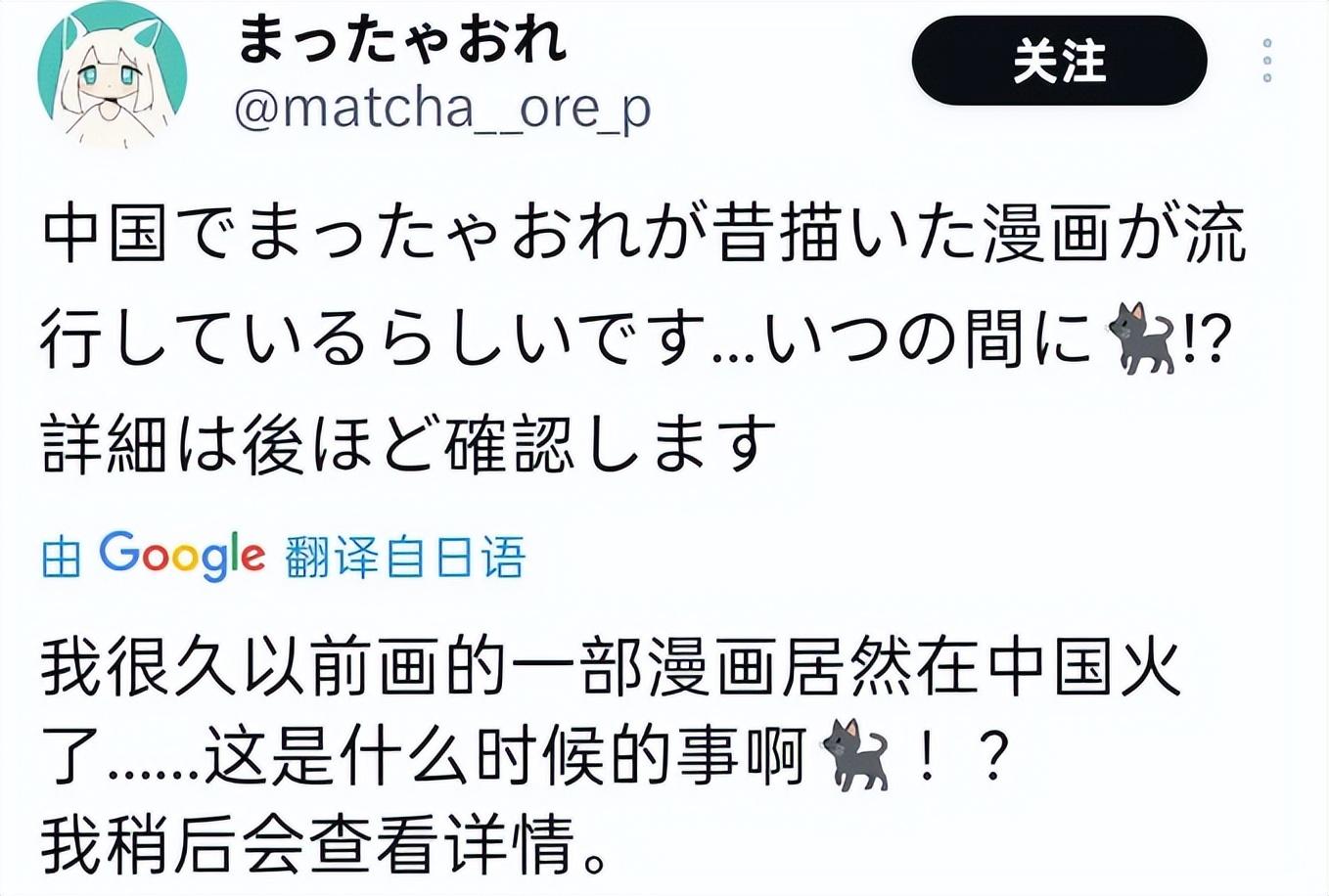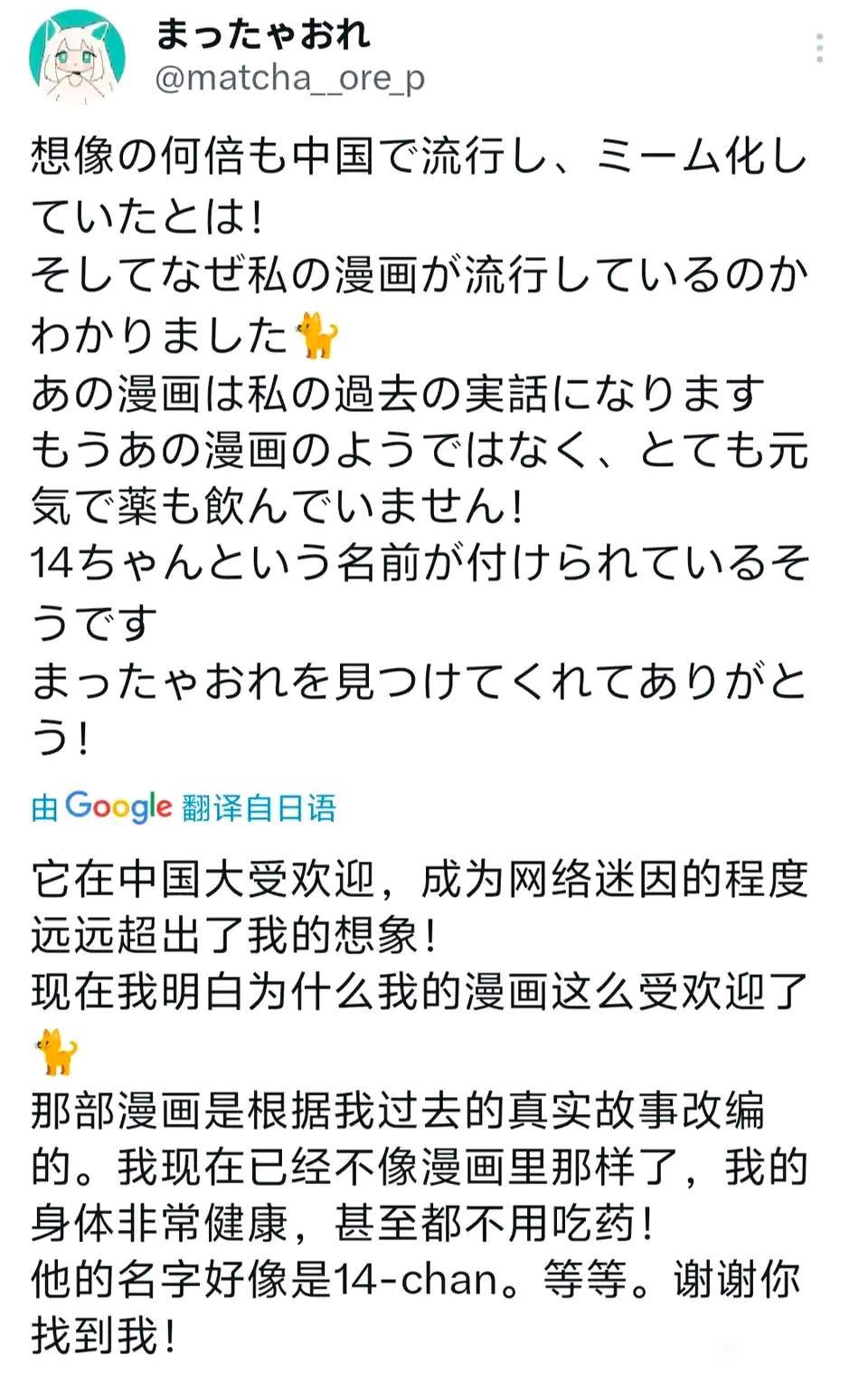 “抹茶オレ”表示:“它在中國大受歡迎,成爲網絡迷因的程度遠遠超出了我的想象!現在我明白爲什麼我的漫畫這麼受歡迎了——那部漫畫是根據我過去的真實故事改編的。