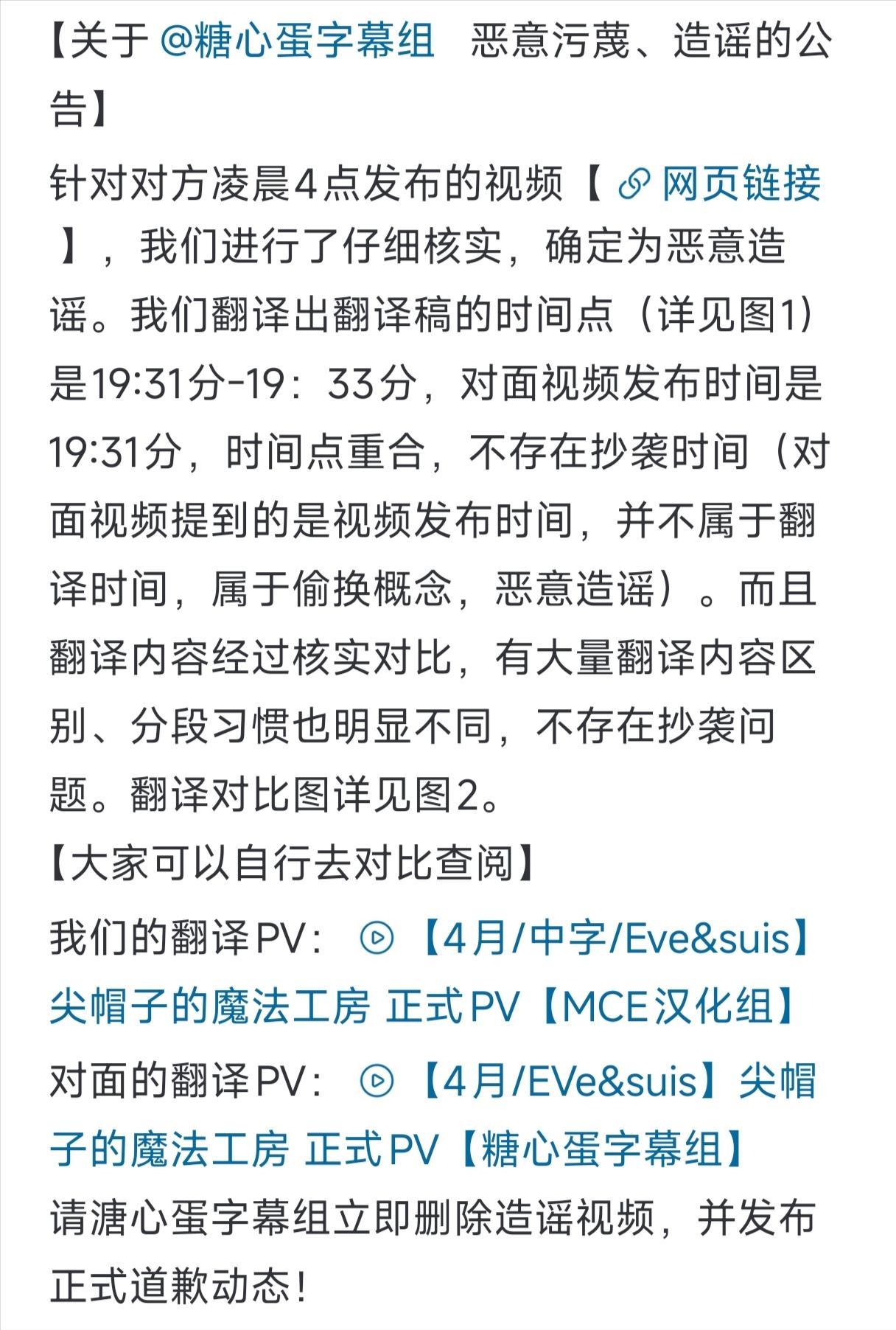 表示,雙方發佈的視頻時間雖然相近,但自家翻譯完成時間實際在19點31分到19點33分,只是單純的發佈視頻時間比對方晚了十幾分鍾,並且曬出截圖,同時反駁對方的控訴,指責對方惡意污衊造謠。