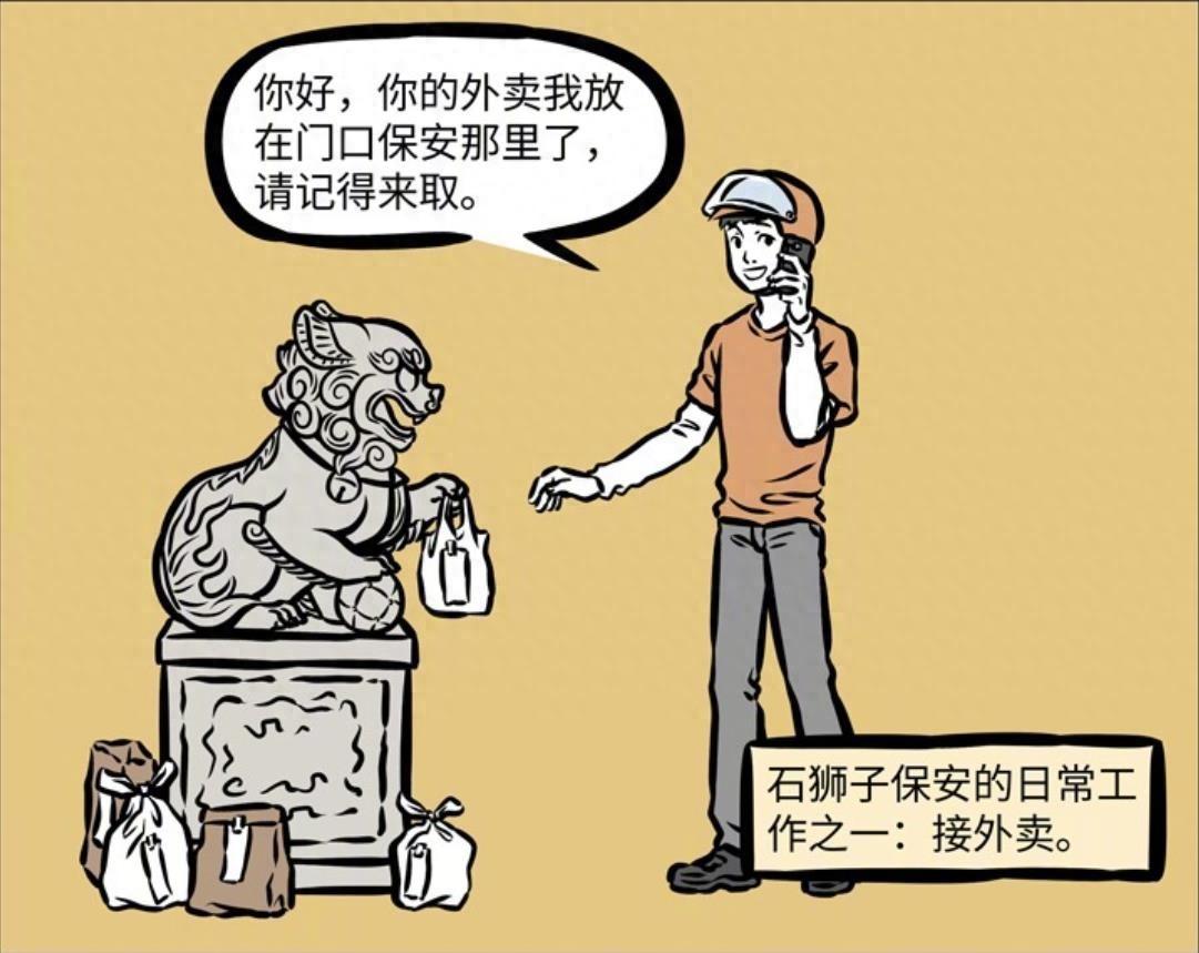 雖然小劉的日常工作就與所有石獅子一樣,站在大門口,但隨着現代社會發展,小劉的工作也日益增多,比如收外賣就是石獅子小劉的日常工作之一