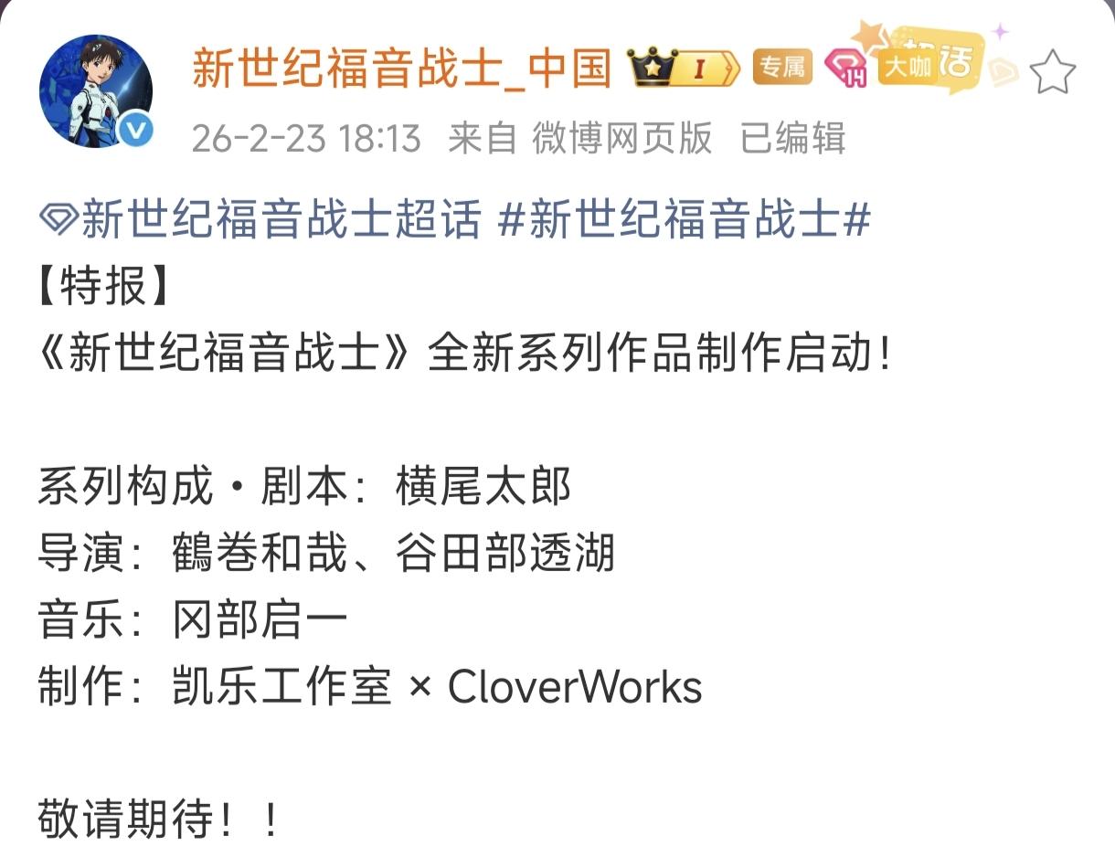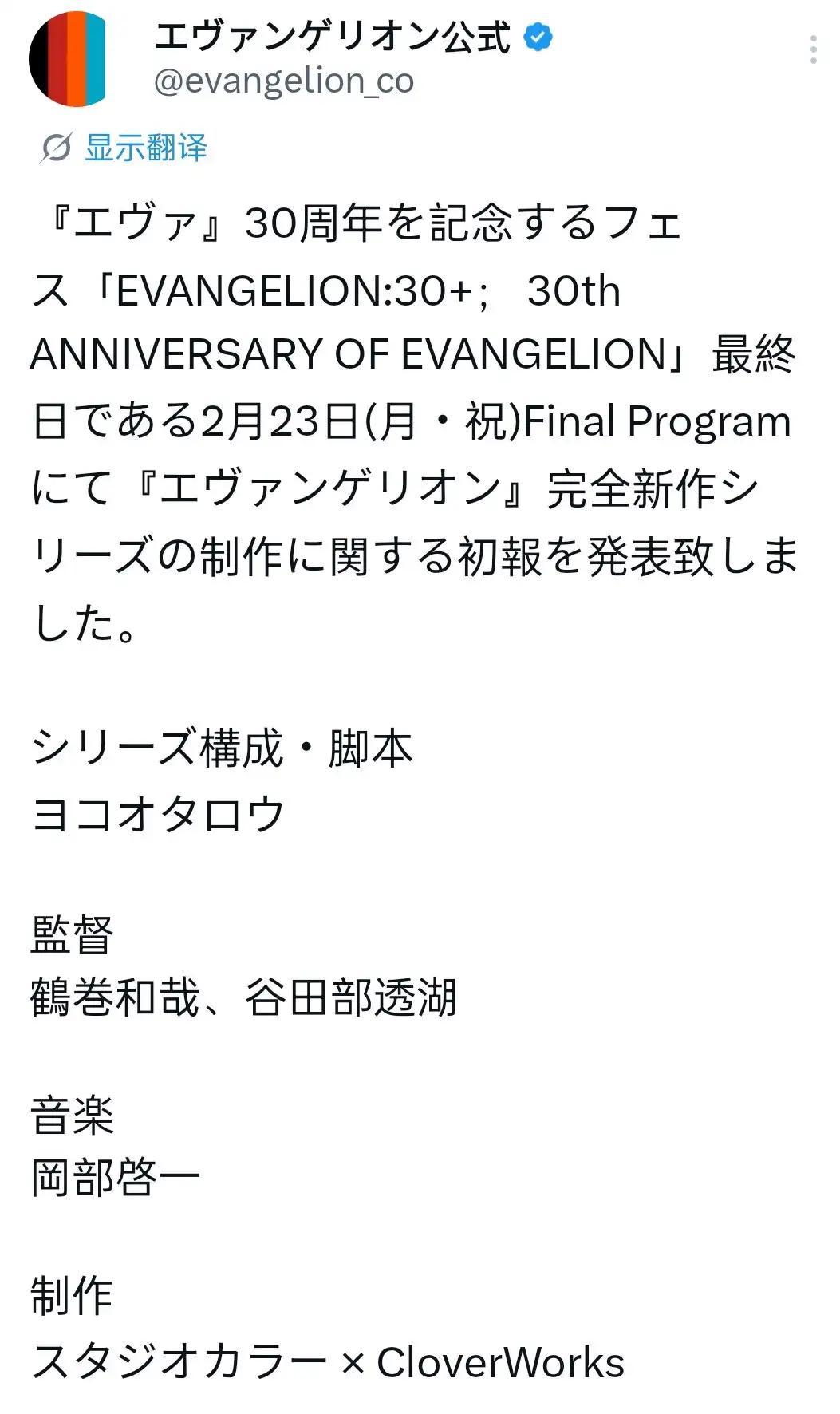 然而,就在大家以爲,這已經是《EVA》最後的告別時,在此次的30週年活動上,官方再次曝出,《EVA》完全新作的動畫企劃。