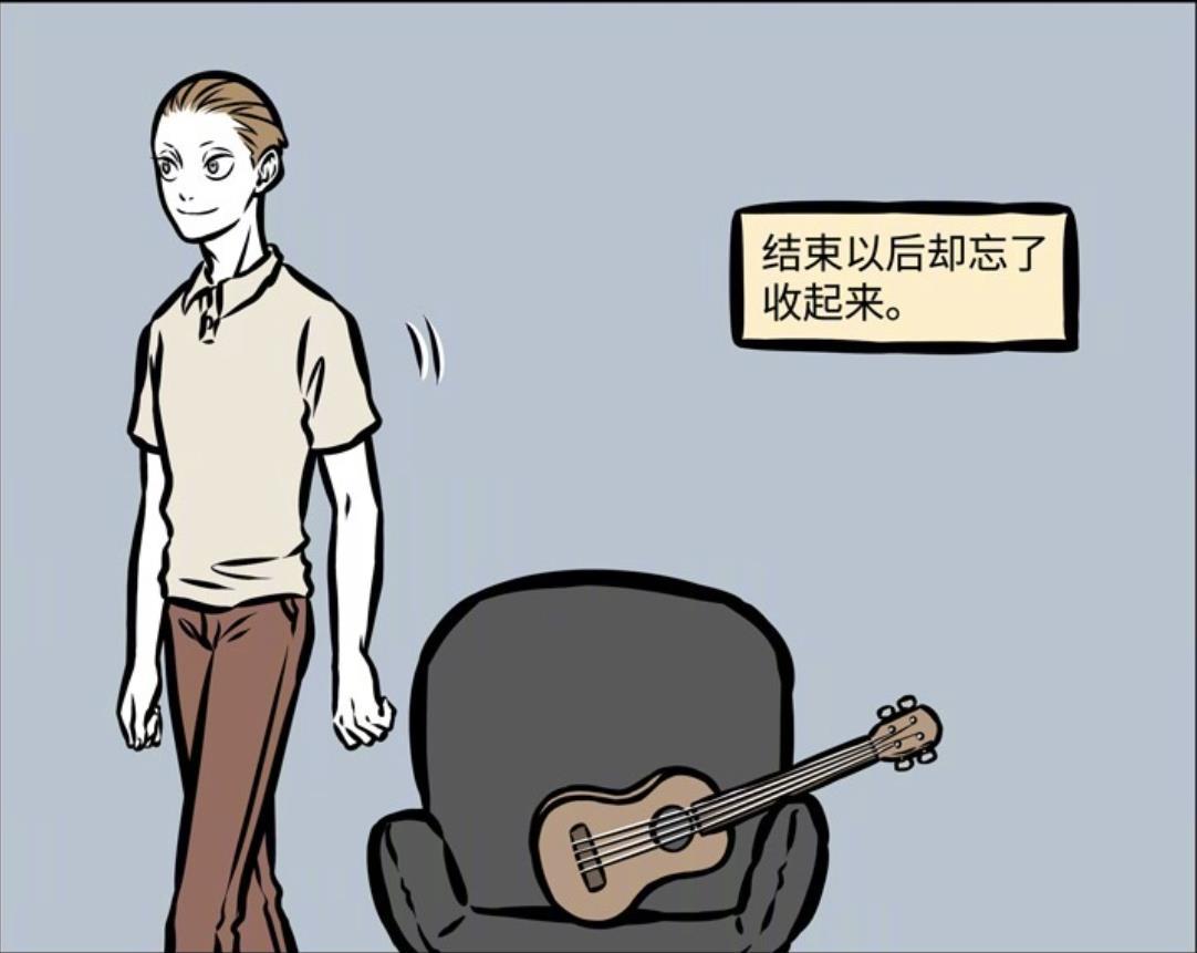 沒過多久金蟾意識到自己彈完的尤克里裏沒有收起來,回到原本放置尤克里裏的地方。