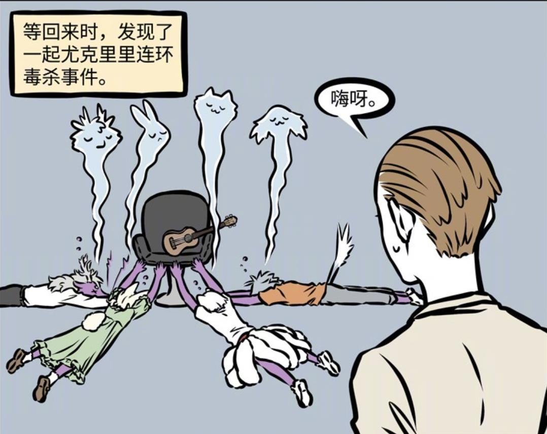 隨後就看到令人意想不到的一幕,尤克里裏依舊好好地放在椅子上,但在椅子周圍圍了一圈紫色皮膚的人,可以看出分別是敖烈、小玉、九月和哮天,他們無一例外都已經呈現出靈魂出竅的狀態,顯然都被金蟾毒素影響。