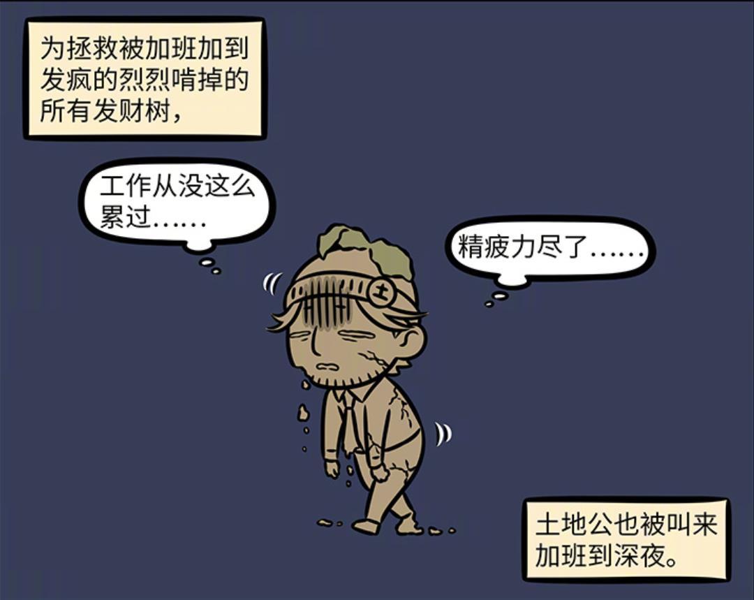 爲了保證公司發財樹第二天完好如初,土地公直接加班到深夜,整個人都累掉土了,此時的土地公感受到前所未有的疲勞