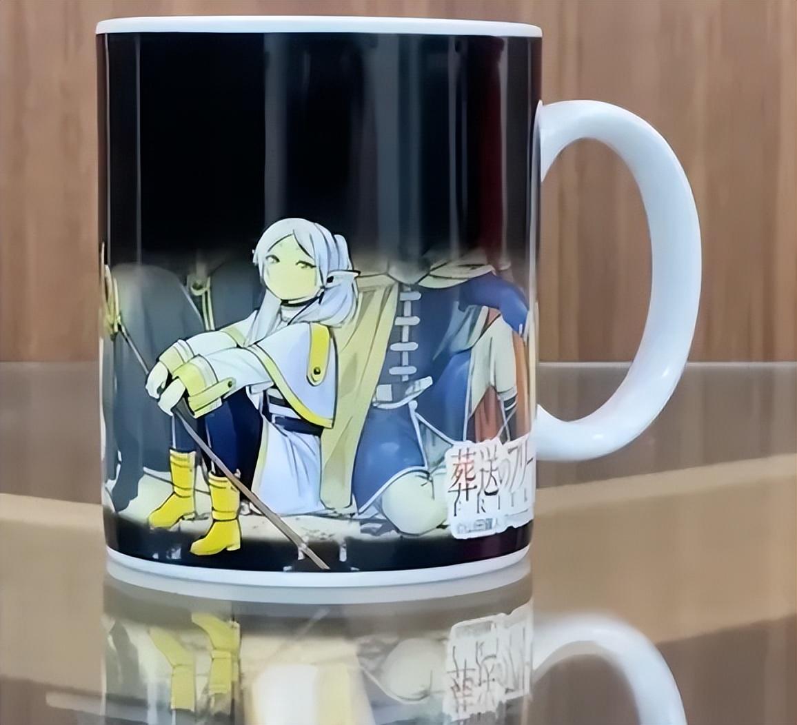比如這款熱感應水杯,加熱的時候是冒險小分隊四人組依偎在一起的畫面,但一旦水變冷了,部分圖案便會消失,小分隊只剩下芙莉蓮一人