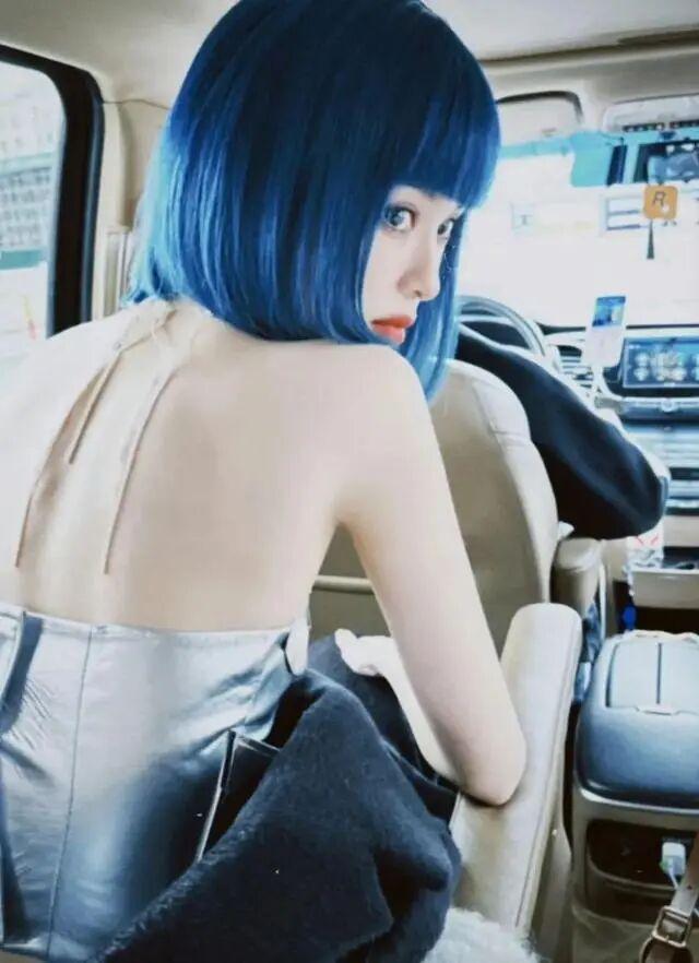 孟子義的這款造型源於綜藝《萌探探探案》,淺色瞳孔+藍色頭髮+銀色衣服,讓整個科技感滿滿,大露背的設計更是讓其科技感的同時多了一絲嫵媚和動人