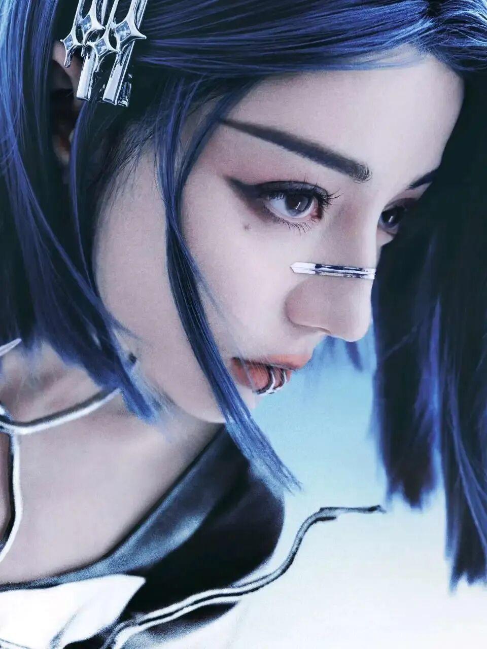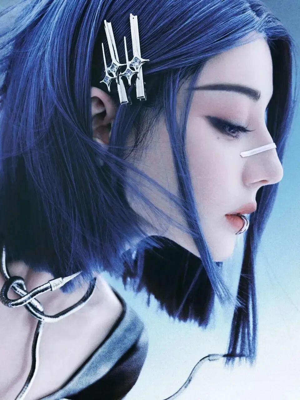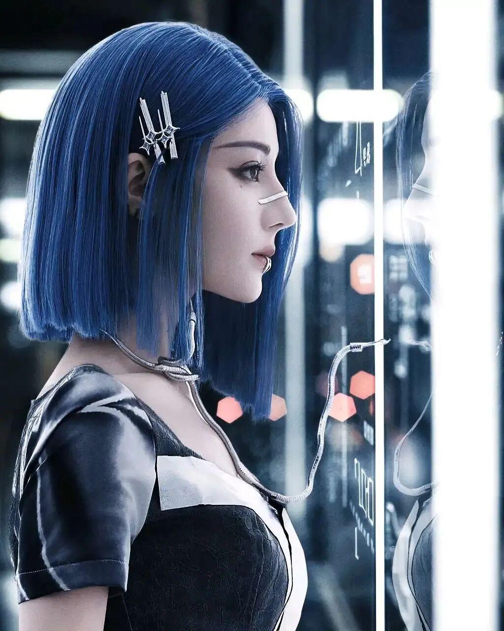 迪麗熱巴這款機械姬造型可以說將賽博朋克展現得淋漓盡致,中長的藍色頭髮,搭配上銀色套裙,未來感撲面而來,別看熱巴還原效果極佳,但其實這種髮色和服裝對顏值要求極高,得虧熱巴顏值足夠高,才能完美駕馭這種服裝造型