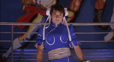 cos春麗的除了女生,還有不少男性也會反串cos春麗這一角色,其中最出彩的莫過於成龍大哥在《城市獵人》中cos的春麗,每一個動作都和遊戲中的春麗一模一樣