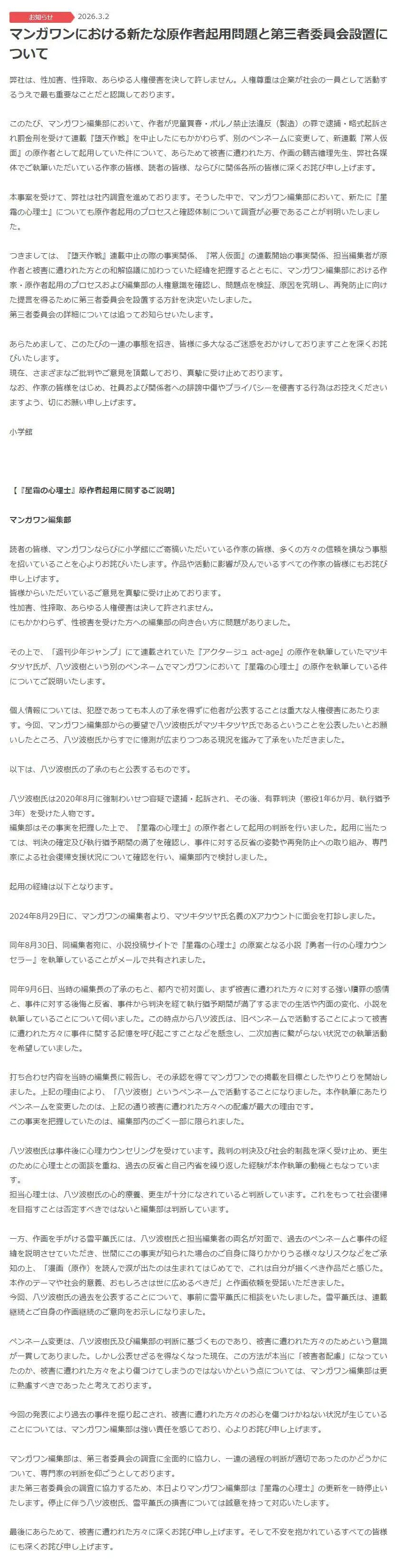 而後小學館於3月2日發佈的一條堪稱自首的長文聲明更是證明了這一切