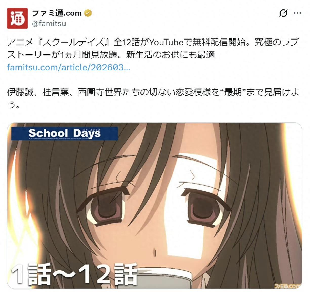 “《School Days》全12話在YouTube免費公開,這部極致的戀愛故事將免費放送一個月,非常適合作爲新生活的陪伴。”