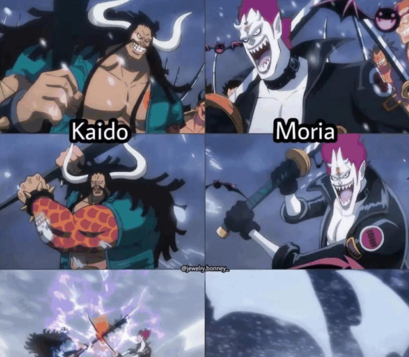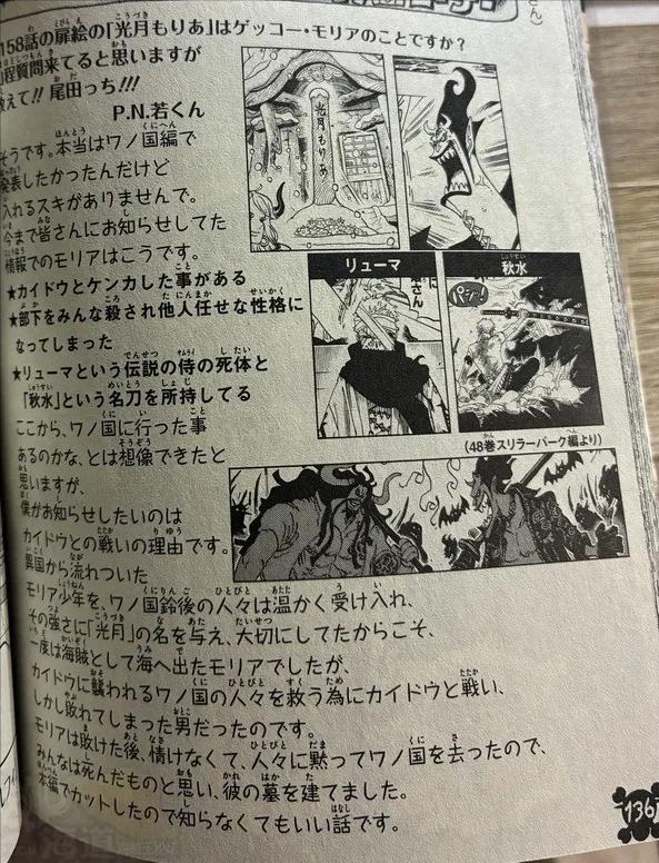 尾田:沒錯。我本來想在和之國篇期間公開這個設定,但一直找不到合適的時機插入。根據至今公佈給大家的信息,莫利亞的經歷包含:他曾與凱多交戰。在船員全部被殺之後,他形成了依賴他人的性格。他擁有傳奇武士龍馬的遺體,以及名刀“秋水”。