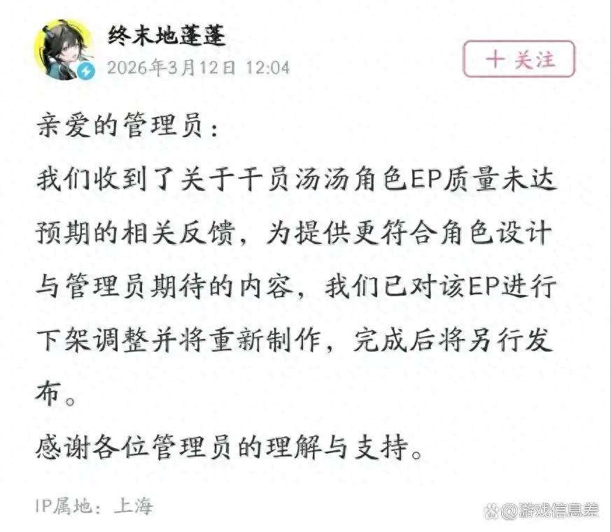 我們收到了關於幹員湯湯角色EP質量未達預期的相關反饋,爲提供更符合角色設計與管理員期待的內容,我們已對該EP進行下架調整並將重新制作,完成後將另行發佈。