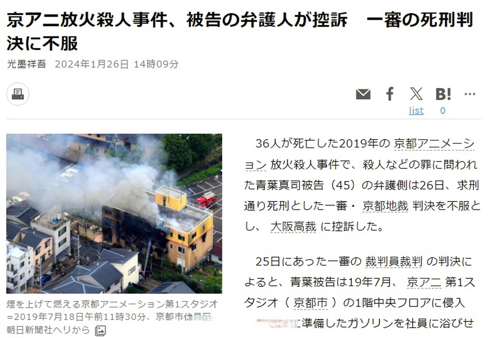 2024年1月,京都地方法院對青葉真司作出一審判決,認定其犯有殺人、縱火等罪行,判處死刑。