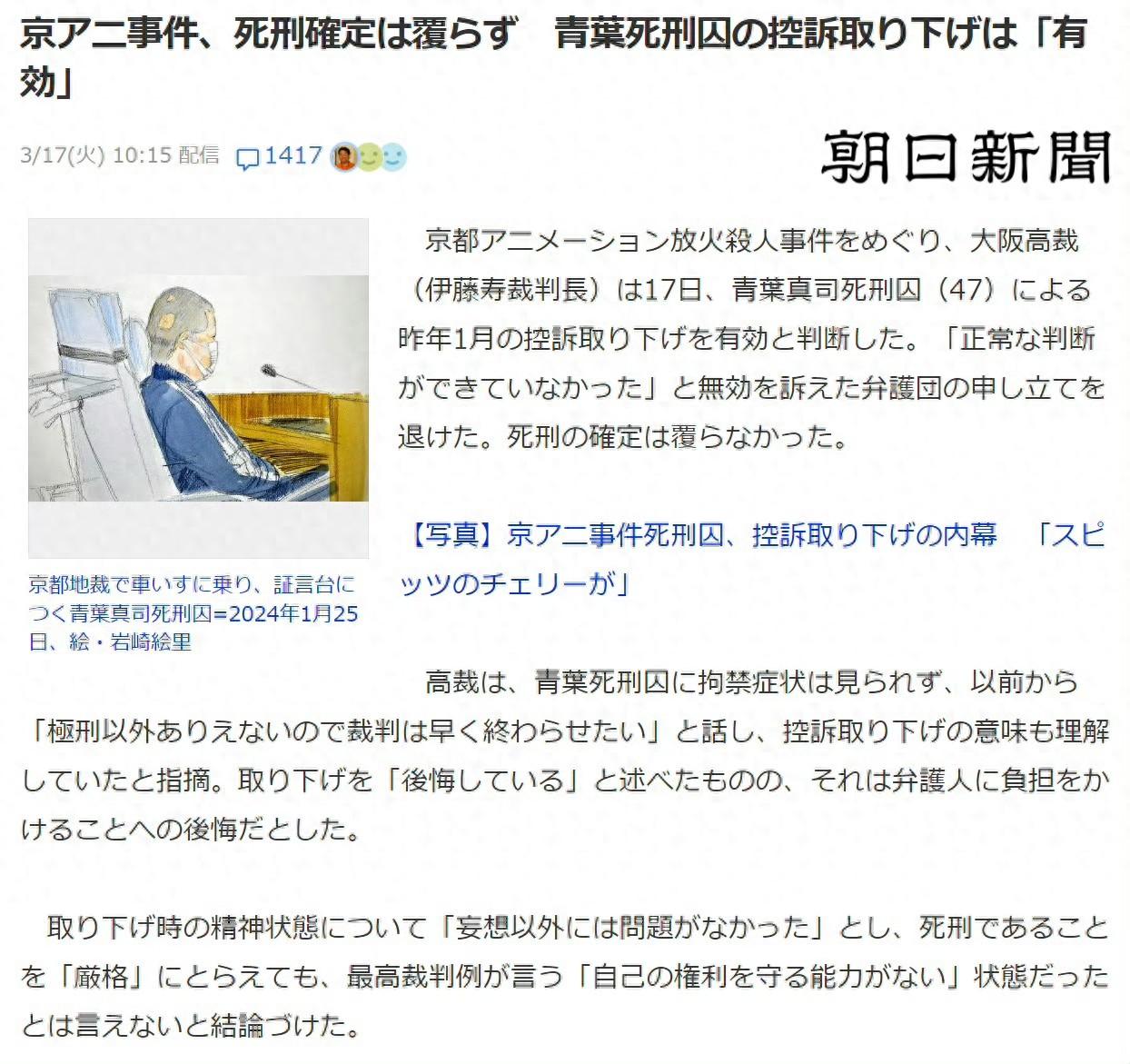 2026年3月17日,日本大阪高等法院做出裁決,認定青葉真司去年1月撤回上訴的行爲有效,駁回辯護律師團以“無法做出正常判斷”爲由要求認定撤回無效的申請。
