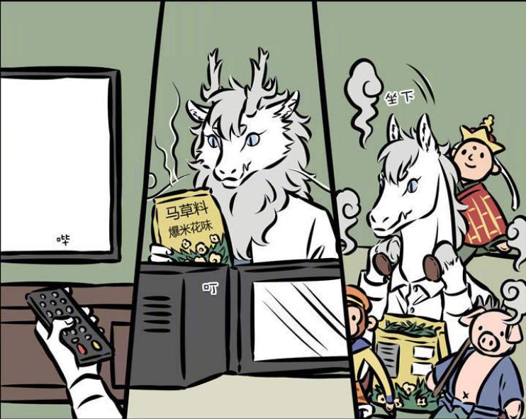 隨後就看到敖烈打開電視,拿出特意準備的馬草料,是十分有意思的爆米花口味,最後更是找出西遊四人組的人偶