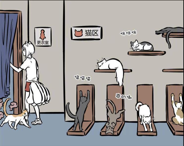 值得一提的是,因爲這個毛毛會所針對的是有毛髮的動物,爲了讓用戶更好的放鬆自己,會所的顧客都會提前變回原形,比如女更衣間隔壁的貓區,有幾隻貓咪正在貓抓板上玩耍,有幾隻貓咪則趴着休息
