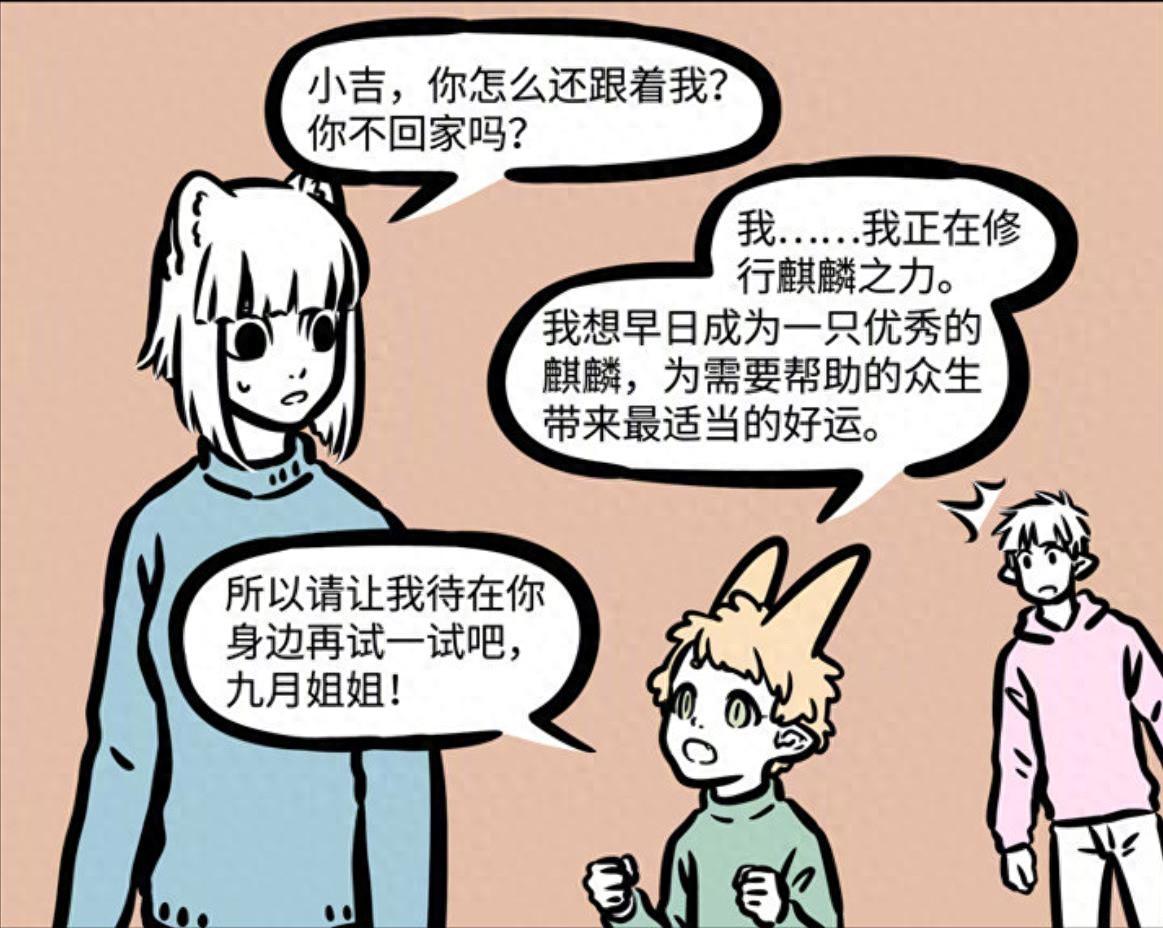 大概因爲之前沒有好好幫助九月,小吉表示自己正在修煉麒麟之力,希望能夠早點成爲一隻優秀的麒麟,爲衆人帶來好運,因此他想繼續待在九月身邊好好訓練一下