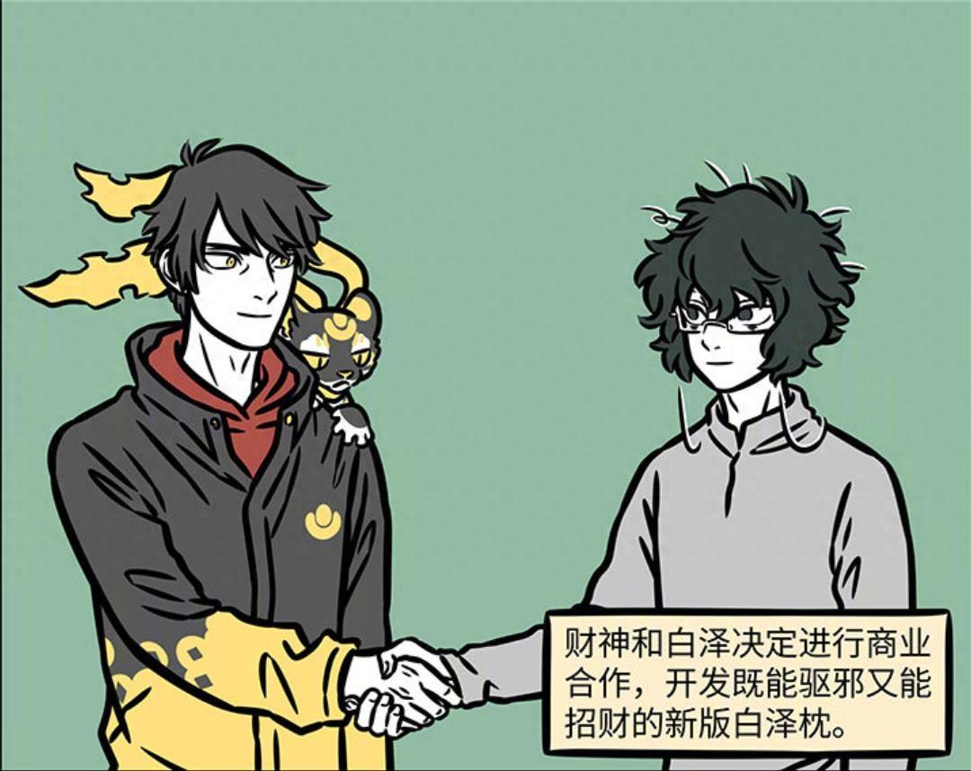 這天白澤和財神決定進行商業合作,兩人準備結合兩人的能力,開發一款既能驅邪又能招財的新版白澤枕