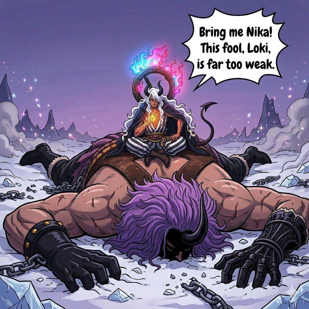 於是就出現了太陽神尼卡路飛+尼德霍格形態洛基,雙尼激戰惡魔的伊姆。這個畫面彷彿重回800多年前的一幕。也是兩個大佬跟伊姆幹架,後面伊姆通過能力迷惑了那位巨人族戰神,最終導致戰神跟尼卡大打出手。
