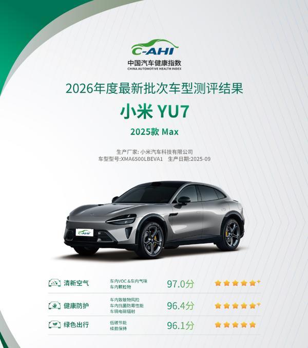 【CNMO科技消息】2月3日,CNMO注意到,小米汽車官方宣佈,在C-AHI中國汽車健康指數實測中,小米YU7 Max在清新空氣、健康防護、綠色出行三大測評維度均斬獲最高評級,分別爲清新空氣5星+、健康防護5星+、綠色出行5星,此前該車型還榮獲了「五星健康車」的稱號。