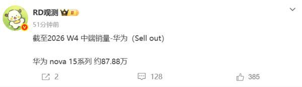 【CNMO科技消息】2月3日,數碼博主“RD觀測”爆料稱,截至2026年第4周,華爲nova 15系列銷量約爲87.88萬臺。