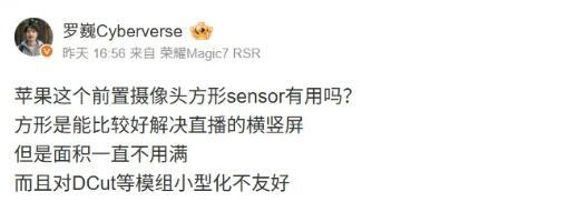 從產品定位與技術權衡來看,方形傳感器更可能成爲一種“高端或專屬特性”。方形傳感器雖然提升了體驗,但也存在物理侷限。榮耀羅巍指出了兩點:一是“面積一直不用滿”,在輸出標準矩形照片時,傳感器角落區域實際被裁剪,存在物理像素的浪費;二是“對DCut等模組小型化不友好”,其形狀可能對追求極致輕薄或複雜多攝模組(如潛望式長焦)的堆疊設計帶來挑戰。因此,它可能更適合對前置影像體驗有極致追求的旗艦機型或特定產品線,而無法在所有設備上全面普及。