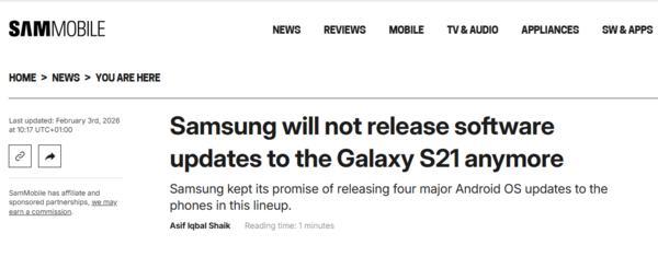 【CNMO科技消息】2月3日,據外媒報道,三星在公佈兼容Galaxy設備的2026年2月安全補丁詳情後,也明確了哪些設備將不再獲得安全更新,以及哪些設備今後的更新頻率會降低。作爲此次調整的一部分,三星S21系列機型將不再接收軟件更新。