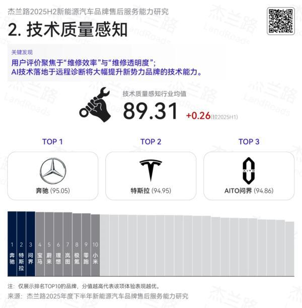 在品牌排名方面,蔚來與問界繼續保持行業領先地位,理想汽車超越特斯拉躍居第三。傳統豪華品牌中,寶馬因回店體驗與權益滿意度提升,排名上升至行業第四;奔馳則在技術能力上持續領跑,但權益服務仍有優化空間。