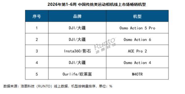 【CNMO科技消息】2月13日,根據洛圖科技(RUNTO)最新發布的《中國運動相機線上零售市場周度追蹤》報告,在涵蓋元旦及春節假期的第1-6周(2025.12.29-2026.02.08),中國運動相機線上零售市場表現亮眼。