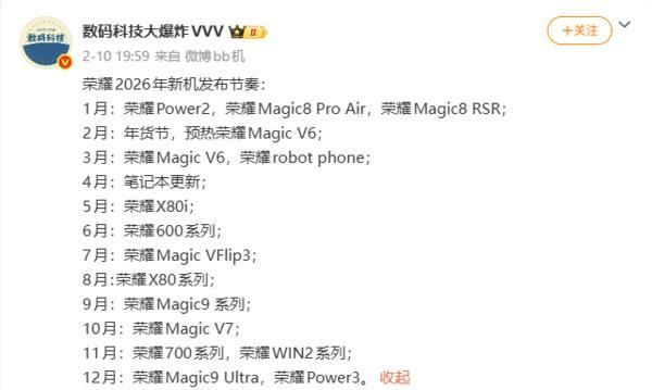 【CNMO科技】近日,有數碼博主整理並分享了榮耀將在2026年發佈的新機。除去已經發布了的榮耀Power2、Magic8 Pro Air以及Magic8 RSR等手機,榮耀還將在今年帶來Magic9系列、ROBOT PHONE等新品。