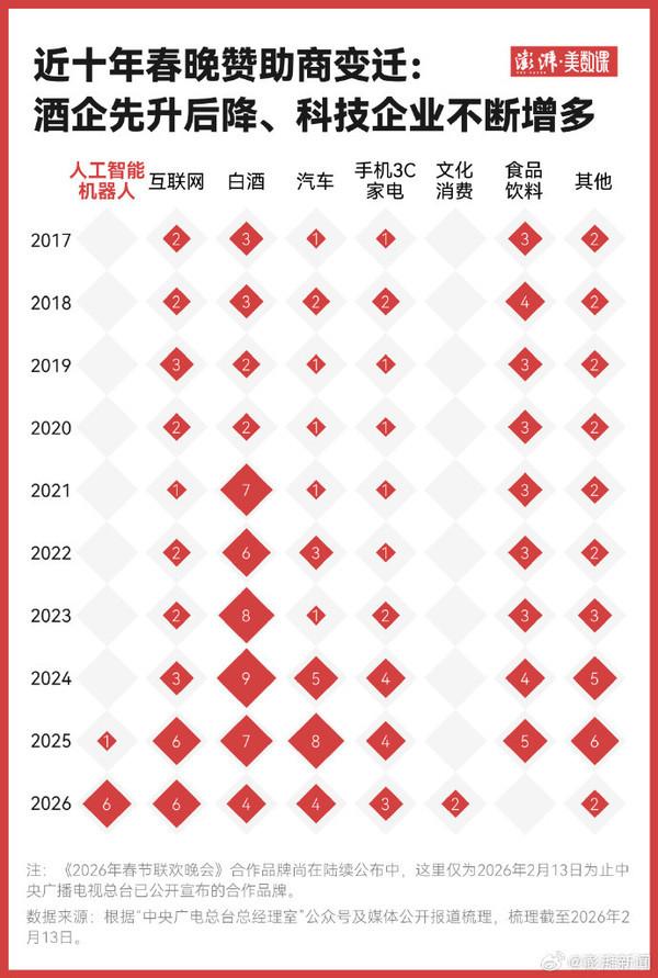CNMO注意到,2015年至2018年,央視春晚主要贊助商以互聯網巨頭、科技公司、汽車品牌爲主。目前,2026年的人工智能機器人板塊和互聯網板塊的春晚贊助商最多,均爲6家;白酒、汽車均爲4家,手機3C家電有3家,文化消費有2家。