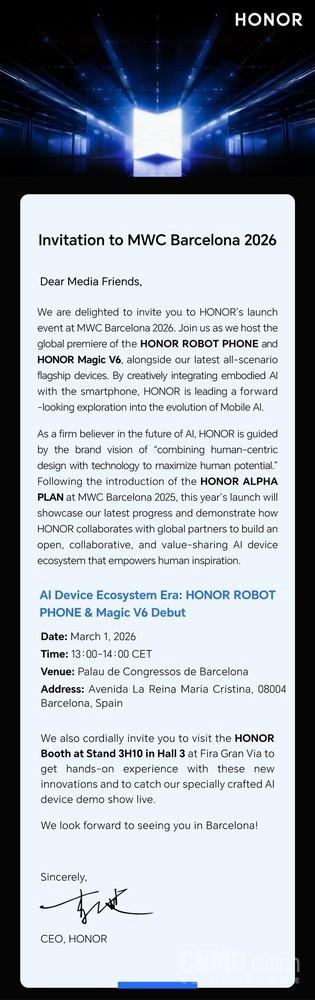 值得一提的是,2026年1月,榮耀正式向發出邀請函,宣佈將於3月1日在巴塞羅那MWC2026展會上,推出兩大重磅新品——榮耀Magic V6和榮耀ROBOT PHONE。