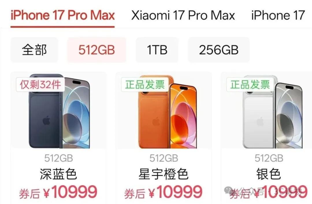 比如512GB的iPhone17ProMax,第三方平臺售價10999元。