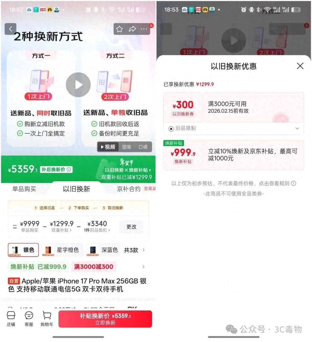 如果以舊換新,那麼可以領取煥新補貼999.9元,滿3000元減300元券。