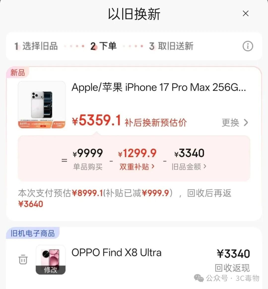 如果疊加以舊換新補貼,那麼iPhone17ProMax的最終到手價格爲5359元。