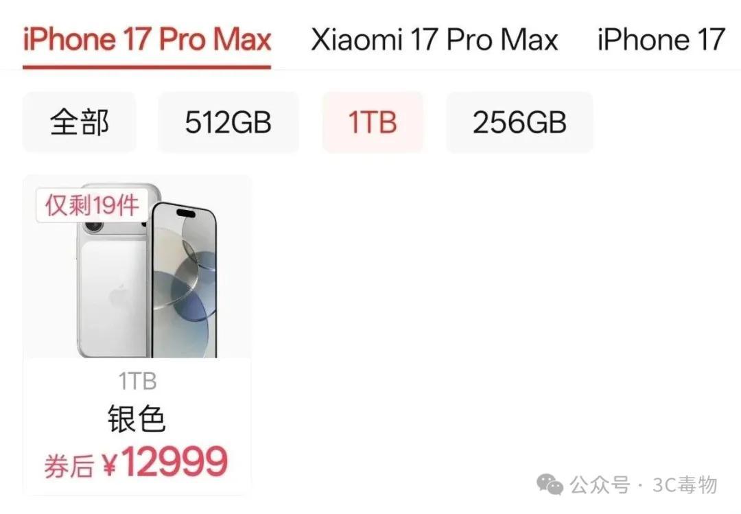 1TB的iPhone17ProMax,第三方平臺售價爲12999元。