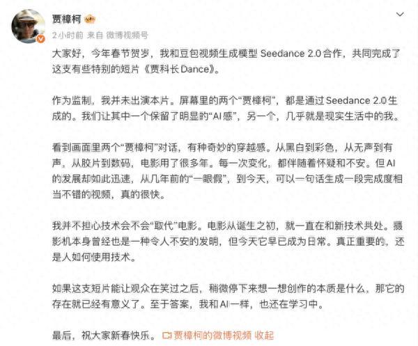 【CNMO科技新聞】近日,著名導演賈樟柯在社交平臺宣佈,他與豆包視頻生成模型Seedance 2.0展開深度合作,共同推出了春節賀歲短片《賈科長 Dance》,標誌着傳統電影創作者在人工智能影像技術應用方面的一次重要嘗試。